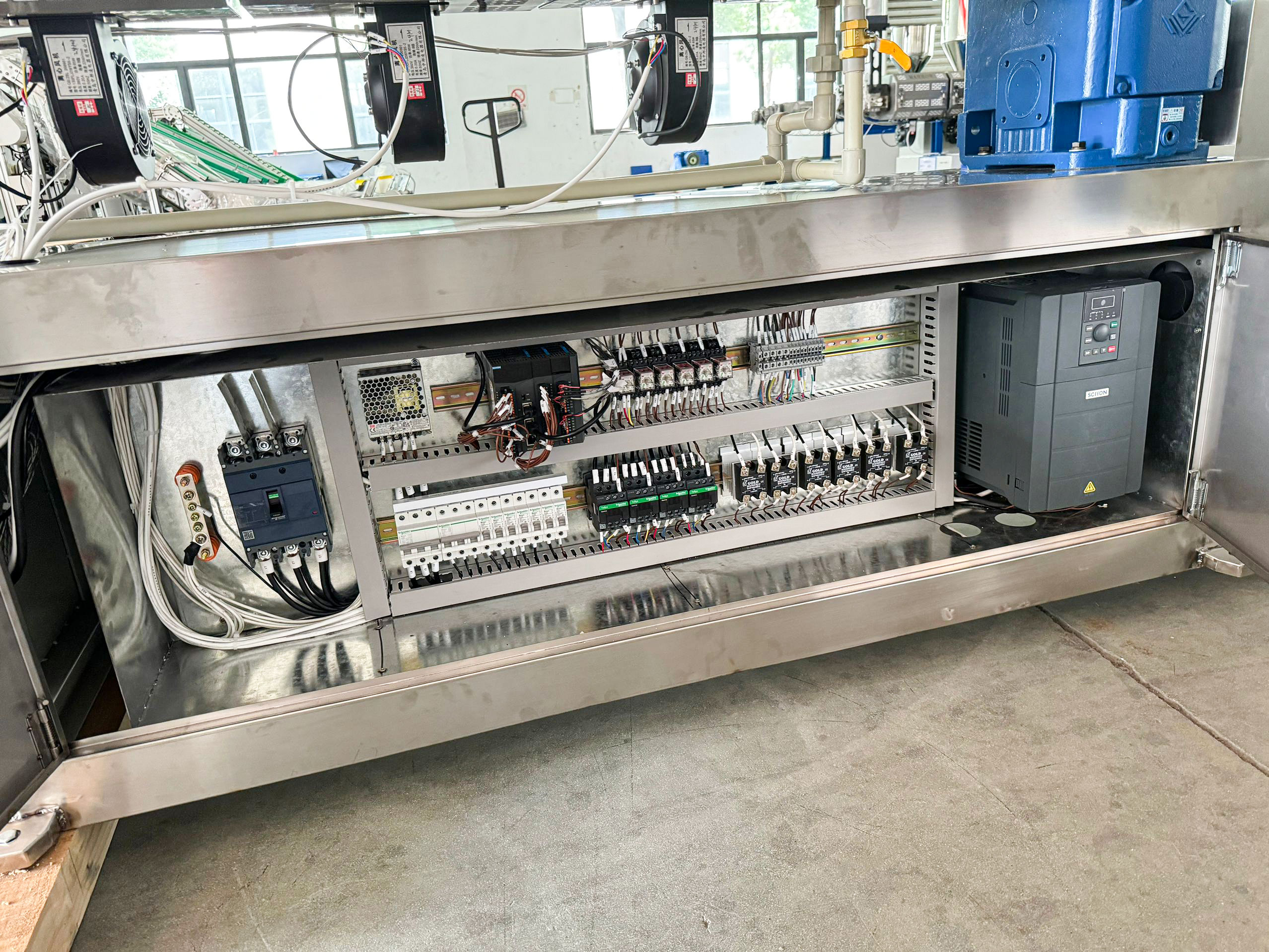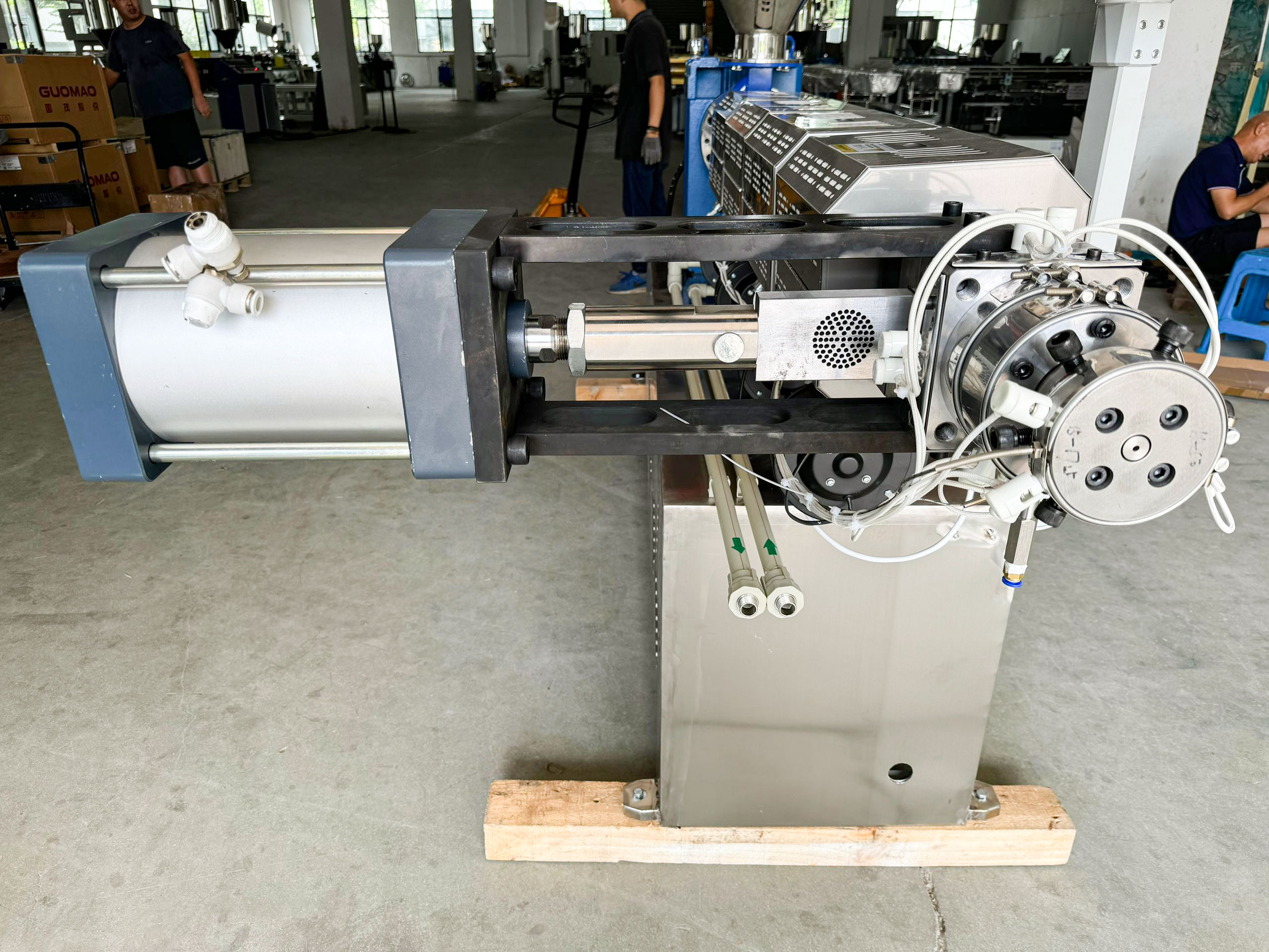 1、 专利结构65m/50mm螺杆设计,33:1长径比,满足PLA和PP料的生产,173/146轮箱,30KW/22KW高效节能型伺服电机;